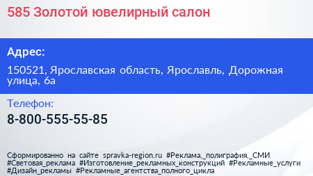 585 Золотой, ювелирный салон по адресу 150521, Ярославская область, Ярославль, Дорожная улица, 6а в дальнейшем Организация, размещена в следующих категориях: