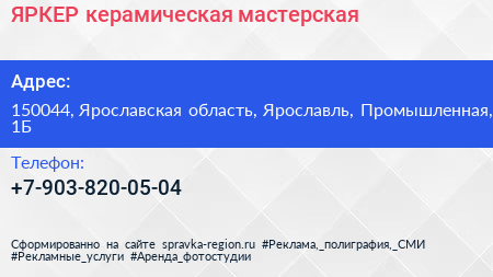 ЯРКЕР, керамическая мастерская по адресу 150044, Ярославская область, Ярославль, Промышленная, 1Б в дальнейшем Организация, размещена в следующих категориях: