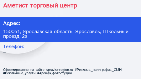 Аметист, торговый центр по адресу 150051, Ярославская область, Ярославль, Школьный проезд, 2а в дальнейшем Организация, размещена в следующих категориях: