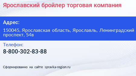 Ярославский бройлер, торговая компания по адресу 150045, Ярославская область, Ярославль, Ленинградский проспект, 54в в дальнейшем Организация, размещена в следующих категориях: