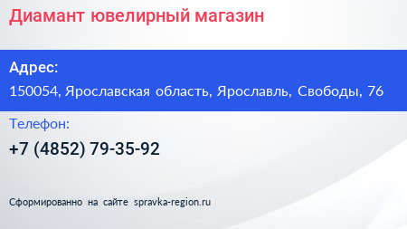 Диамант, ювелирный магазин по адресу 150054, Ярославская область, Ярославль, Свободы, 76 в дальнейшем Организация, размещена в следующих категориях: