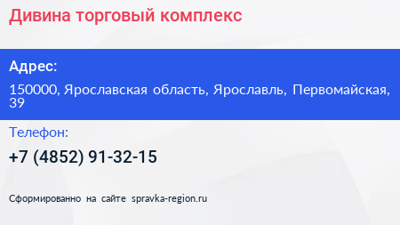 Дивина, торговый комплекс по адресу 150000, Ярославская область, Ярославль, Первомайская, 39 в дальнейшем Организация, размещена в следующих категориях: