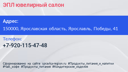ЭПЛ, ювелирный салон по адресу 150000, Ярославская область, Ярославль, Победы, 41 в дальнейшем Организация, размещена в следующих категориях: