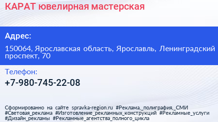 КАРАТ, ювелирная мастерская по адресу 150064, Ярославская область, Ярославль, Ленинградский проспект, 70 в дальнейшем Организация, размещена в следующих категориях: