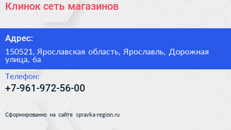 Клинок, сеть магазинов по адресу 150521, Ярославская область, Ярославль, Дорожная улица, 6а в дальнейшем Организация, размещена в следующих категориях:
