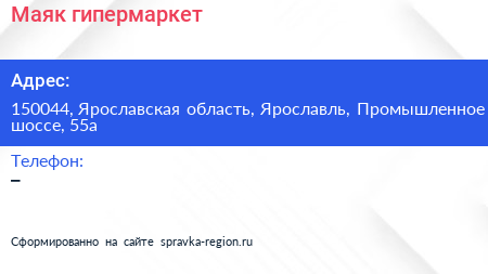 Маяк, гипермаркет по адресу 150044, Ярославская область, Ярославль, Промышленное шоссе, 55а в дальнейшем Организация, размещена в следующих категориях: