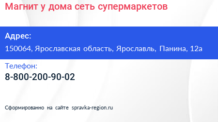Магнит у дома, сеть супермаркетов по адресу 150064, Ярославская область, Ярославль, Панина, 12а в дальнейшем Организация, размещена в следующих категориях: