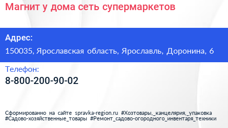 Магнит у дома, сеть супермаркетов по адресу 150035, Ярославская область, Ярославль, Доронина, 6 в дальнейшем Организация, размещена в следующих категориях: