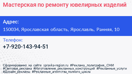 Мастерская по ремонту ювелирных изделий по адресу 150034, Ярославская область, Ярославль, Ранняя, 10 в дальнейшем Организация, размещена в следующих категориях: