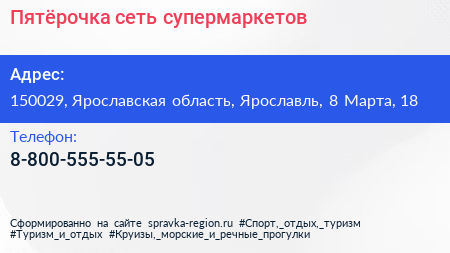 Пятёрочка, сеть супермаркетов по адресу 150029, Ярославская область, Ярославль, 8 Марта, 18 в дальнейшем Организация, размещена в следующих категориях: