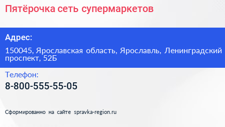 Пятёрочка, сеть супермаркетов по адресу 150045, Ярославская область, Ярославль, Ленинградский проспект, 52Б в дальнейшем Организация, размещена в следующих категориях: