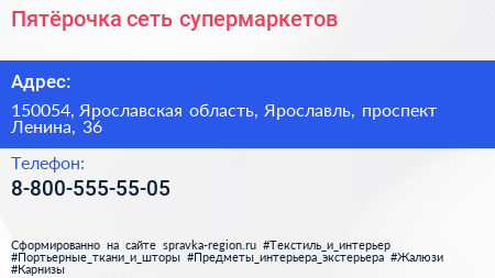 Пятёрочка, сеть супермаркетов по адресу 150054, Ярославская область, Ярославль, проспект Ленина, 36 в дальнейшем Организация, размещена в следующих категориях: