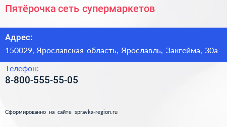 Пятёрочка, сеть супермаркетов по адресу 150029, Ярославская область, Ярославль, Закгейма, 30а в дальнейшем Организация, размещена в следующих категориях: