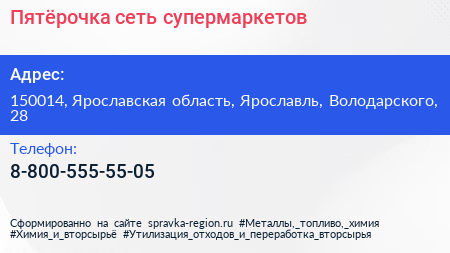 Пятёрочка, сеть супермаркетов по адресу 150014, Ярославская область, Ярославль, Володарского, 28 в дальнейшем Организация, размещена в следующих категориях: