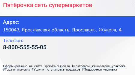 Пятёрочка, сеть супермаркетов по адресу 150043, Ярославская область, Ярославль, Жукова, 4 в дальнейшем Организация, размещена в следующих категориях: