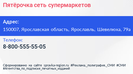 Пятёрочка, сеть супермаркетов по адресу 150007, Ярославская область, Ярославль, Шевелюха, 79а в дальнейшем Организация, размещена в следующих категориях: