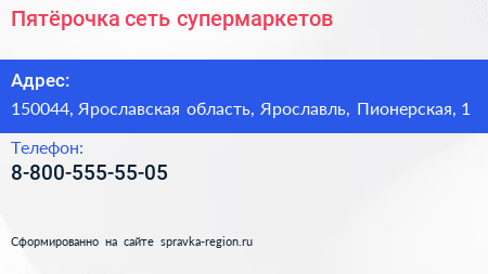 Пятёрочка, сеть супермаркетов по адресу 150044, Ярославская область, Ярославль, Пионерская, 1 в дальнейшем Организация, размещена в следующих категориях: