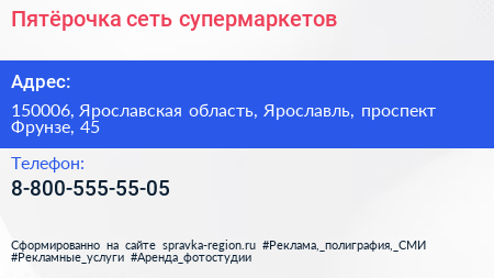 Пятёрочка, сеть супермаркетов по адресу 150006, Ярославская область, Ярославль, проспект Фрунзе, 45 в дальнейшем Организация, размещена в следующих категориях: