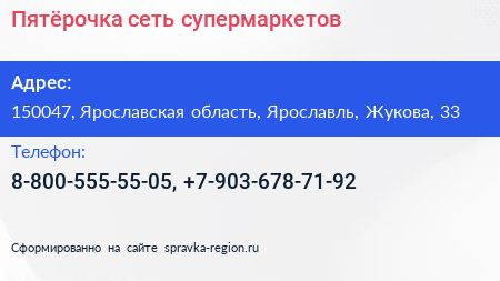 Пятёрочка, сеть супермаркетов по адресу 150047, Ярославская область, Ярославль, Жукова, 33 в дальнейшем Организация, размещена в следующих категориях: