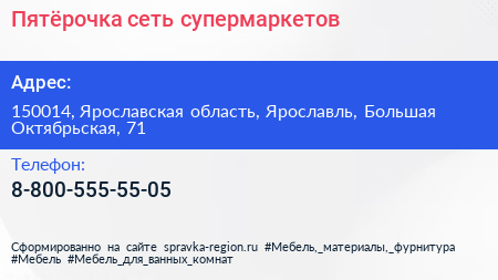 Пятёрочка, сеть супермаркетов по адресу 150014, Ярославская область, Ярославль, Большая Октябрьская, 71 в дальнейшем Организация, размещена в следующих категориях: