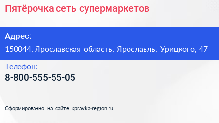 Пятёрочка, сеть супермаркетов по адресу 150044, Ярославская область, Ярославль, Урицкого, 47 в дальнейшем Организация, размещена в следующих категориях: