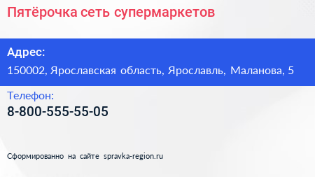 Пятёрочка, сеть супермаркетов по адресу 150002, Ярославская область, Ярославль, Маланова, 5 в дальнейшем Организация, размещена в следующих категориях: