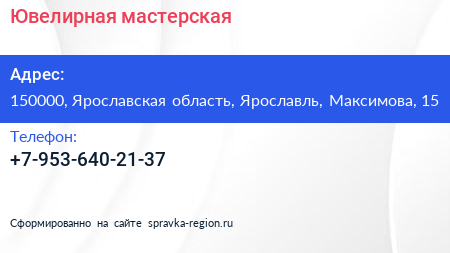 Ювелирная мастерская по адресу 150000, Ярославская область, Ярославль, Максимова, 15 в дальнейшем Организация, размещена в следующих категориях: