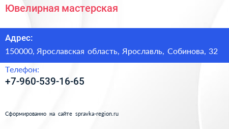 Ювелирная мастерская по адресу 150000, Ярославская область, Ярославль, Собинова, 32 в дальнейшем Организация, размещена в следующих категориях: