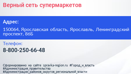 Верный, сеть супермаркетов по адресу 150064, Ярославская область, Ярославль, Ленинградский проспект, 86Б в дальнейшем Организация, размещена в следующих категориях: