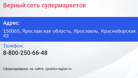 Верный, сеть супермаркетов по адресу 150065, Ярославская область, Ярославль, Красноборская, 43 в дальнейшем Организация, размещена в следующих категориях: