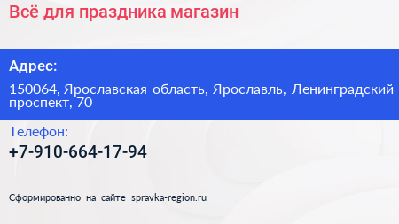 Всё для праздника, магазин по адресу 150064, Ярославская область, Ярославль, Ленинградский проспект, 70 в дальнейшем Организация, размещена в следующих категориях: