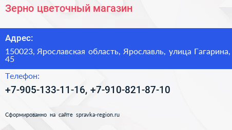 Зерно, цветочный магазин по адресу 150023, Ярославская область, Ярославль, улица Гагарина, 45 в дальнейшем Организация, размещена в следующих категориях: