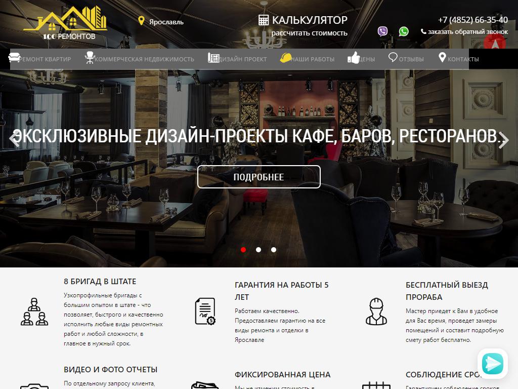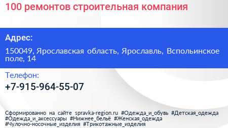 100 ремонтов, строительная компания по адресу 150049, Ярославская область, Ярославль, Вспольинское поле, 14 в дальнейшем Организация, размещена в следующих категориях: