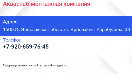 Акваснаб, монтажная компания по адресу 150001, Ярославская область, Ярославль, Карабулина, 33 в дальнейшем Организация, размещена в следующих категориях: