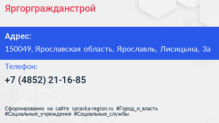 Яргоргражданстрой по адресу 150049, Ярославская область, Ярославль, Лисицына, 3а в дальнейшем Организация, размещена в следующих категориях: