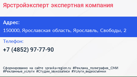 Ярстройэксперт, экспертная компания по адресу 150000, Ярославская область, Ярославль, Свободы, 2 в дальнейшем Организация, размещена в следующих категориях: