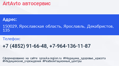 ArtAvto, автосервис по адресу 150029, Ярославская область, Ярославль, Декабристов, 135 в дальнейшем Организация, размещена в следующих категориях: