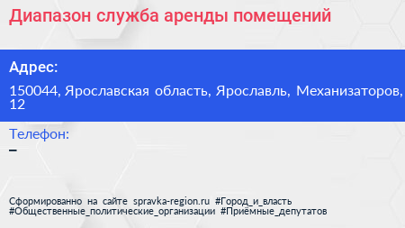 Диапазон, служба аренды помещений по адресу 150044, Ярославская область, Ярославль, Механизаторов, 12 в дальнейшем Организация, размещена в следующих категориях: