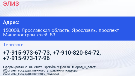 ЭЛИЗ по адресу 150008, Ярославская область, Ярославль, проспект Машиностроителей, 83 в дальнейшем Организация, размещена в следующих категориях: