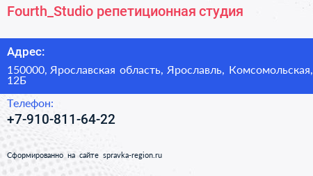 Fourth_Studio, репетиционная студия по адресу 150000, Ярославская область, Ярославль, Комсомольская, 12Б в дальнейшем Организация, размещена в следующих категориях: