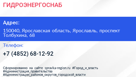 ГИДРОЭНЕРГОСНАБ по адресу 150040, Ярославская область, Ярославль, проспект Толбухина, 68 в дальнейшем Организация, размещена в следующих категориях: