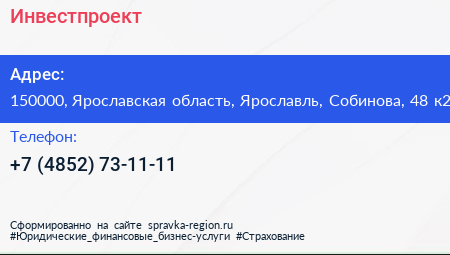 Для связи с организацией воспользуйтесь номером телефона: +7 (4852) 73-11-11. Пн: c 09:00-17:00, Вт: c 09:00-17:00, Ср: c 09:00-17:00, Чт: c 09:00-17:00, Пт: c 09:00-17:00, Сб: выходной, Вс: выходной, вы можете обратиться в эту организацию.