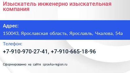 Изыскатель, инженерно-изыскательная компания по адресу 150043, Ярославская область, Ярославль, Чкалова, 54а в дальнейшем Организация, размещена в следующих категориях: