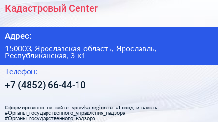 Кадастровый Center по адресу 150003, Ярославская область, Ярославль, Республиканская, 3 к1 в дальнейшем Организация, размещена в следующих категориях: