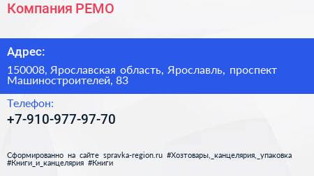 Компания РЕМО по адресу 150008, Ярославская область, Ярославль, проспект Машиностроителей, 83 в дальнейшем Организация, размещена в следующих категориях: