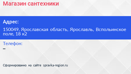 Магазин сантехники по адресу 150049, Ярославская область, Ярославль, Вспольинское поле, 18 к2 в дальнейшем Организация, размещена в следующих категориях: