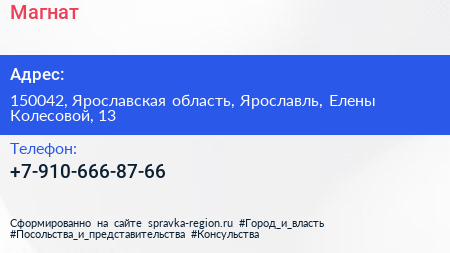 Магнат по адресу 150042, Ярославская область, Ярославль, Елены Колесовой, 13 в дальнейшем Организация, размещена в следующих категориях: