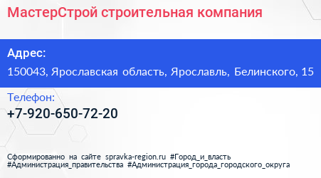 МастерСтрой, строительная компания по адресу 150043, Ярославская область, Ярославль, Белинского, 15 в дальнейшем Организация, размещена в следующих категориях: