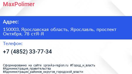 MaxPolimer по адресу 150003, Ярославская область, Ярославль, проспект Октября, 78 стЯ-Я в дальнейшем Организация, размещена в следующих категориях: