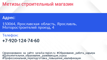 Метизы, строительный магазин по адресу 150064, Ярославская область, Ярославль, Моторостроителей проезд, 4 в дальнейшем Организация, размещена в следующих категориях: